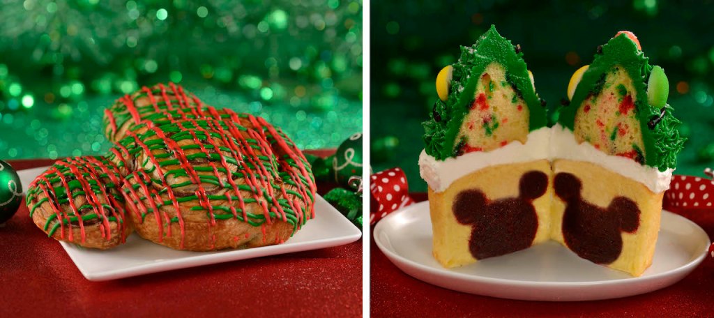 Main Street Bakery: Holiday Mickey Cinnamon Roll – Rollo de canela en forma de Mickey rociado con glaseado rojo y verde Twice Upon a Cupcake: un árbol de Navidad de confeti corona un cupcake de vainilla con un Mickey oculto de red velvet (nuevo).