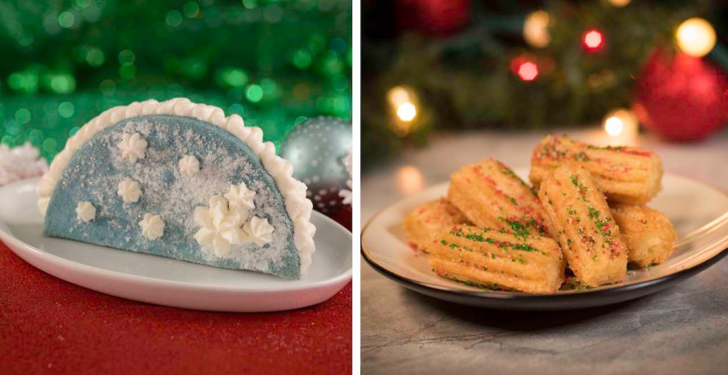 Pecos Bill Tall Tale Inn & Café Let It Snow Taco: galleta de azúcar «taco» rellena con caramelo salado y mousse de chocolate con especias (nuevo). Churros navideños: mini churros cubiertos con azúcar roja y verde.