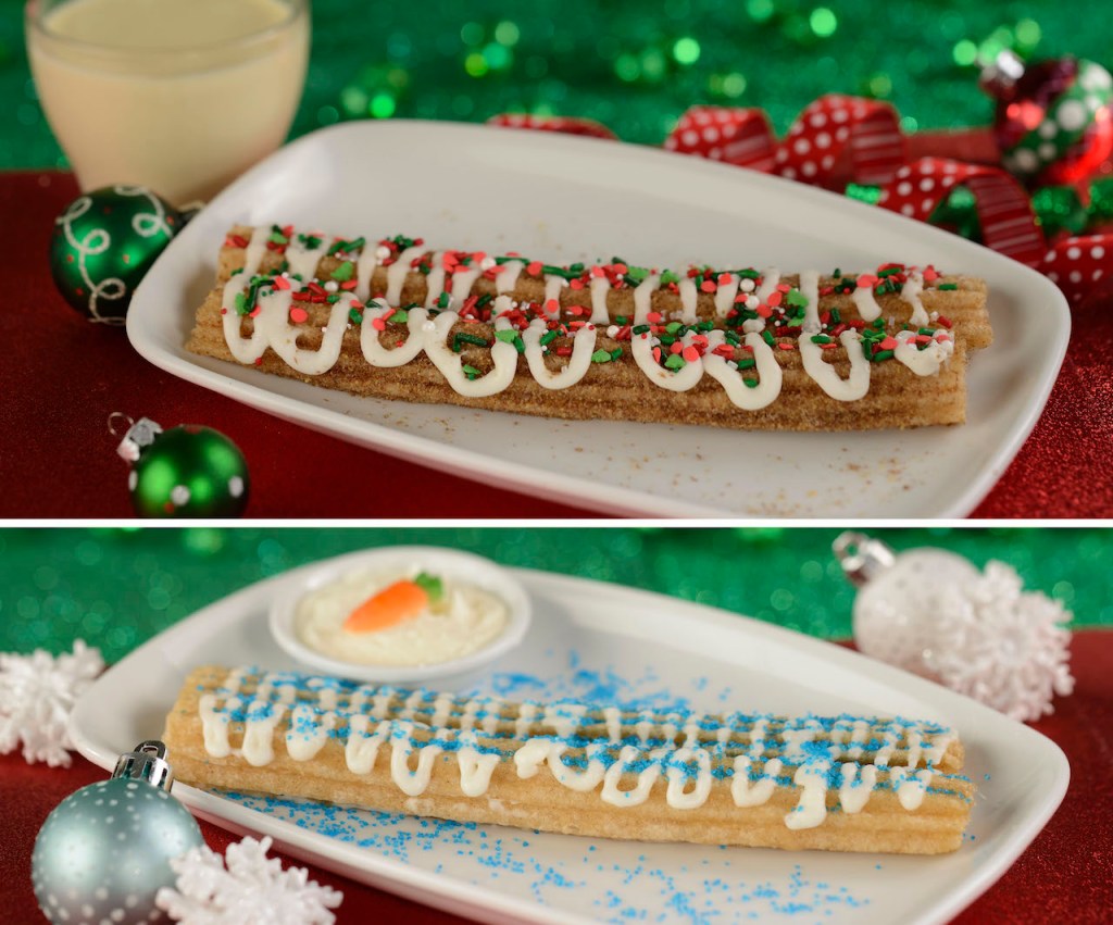 Carro de Main Street Churros de azúcar y especias: churros de galletas navideñas con glaseado y chispas navideñas, servidos con una guarnición de ponche de huevo (nuevo)