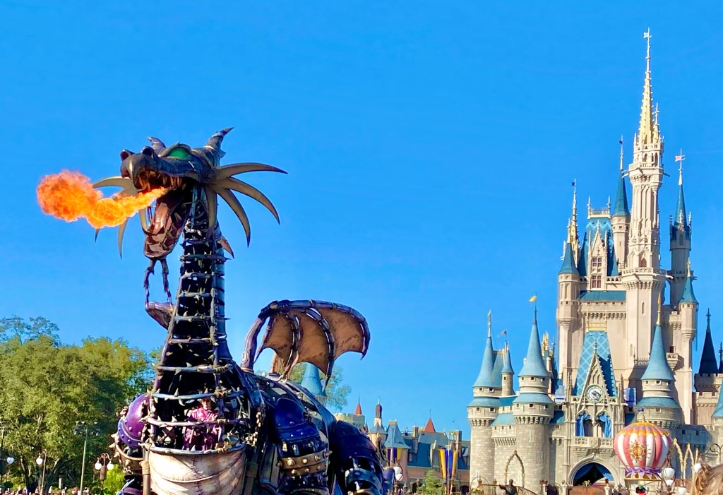 Es uno de los imperdibles de cada una de nuestras visitas, es «EL DESFILE DISNEY». Aunque el diseño de los carros, la música y los personajes son increíbles nuestra estrella es el Dragón de Maléfica !